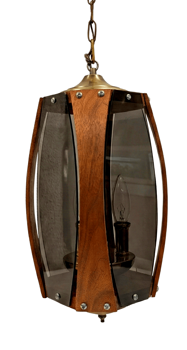 Walnut and Smoked Plexiglass Hanging Lamp from Lawrin, c. 1960-70s $200